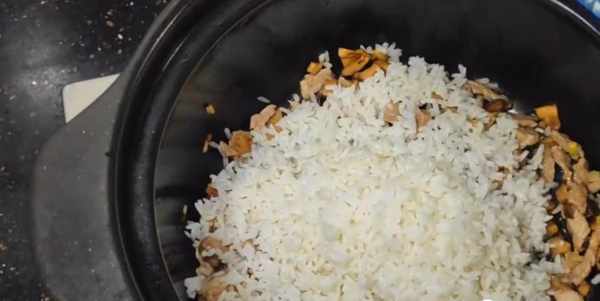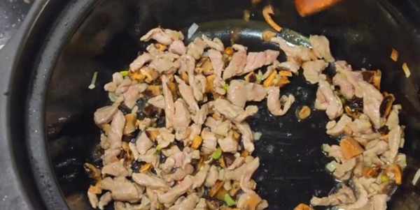 倒入香菇丁一起翻炒,炒出香味。炒出香味後來一點料酒去腥增鮮,翻炒幾下,將提前泡好的米倒入鍋中,然後將米翻炒均勻就可以。