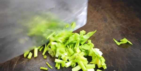 備一小截蔥白,切成蔥花,然後放到碗中備用。準備三顆提前浸泡好的香菇,先切香菇絲,然後再切成丁,然後放一盤備用。準備芹菜幾顆,然後切成末,切好後放到碗中備用。