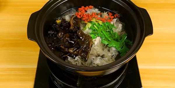 水開,我們下入銀耳、芹菜、木耳、枸杞,蓋蓋煮一分鐘後將銀耳、木耳一同撈出。備用。