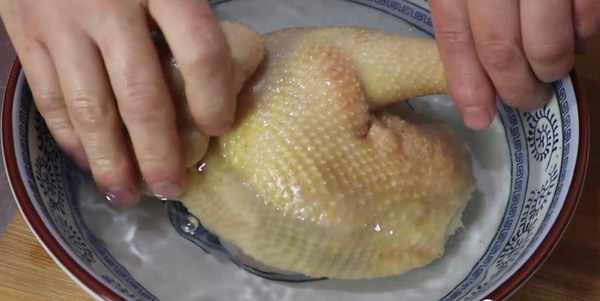 然後取出。然後放入冷水中泡一下,這樣煮出來的雞皮不容易爛,而且可口感更脆。