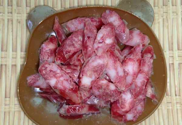 4.鍋中加入適量的油,將切好後的臘腸放入鍋裡面,用小火煸炒一下。經過炒後可以將裡面多餘的油脂煸出來,臘腸口感更好;