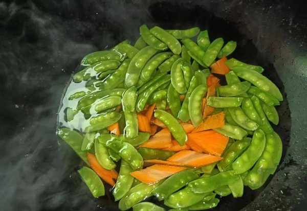 5.大腸炒香之後,我們再把焯水後的荷蘭豆跟胡蘿卜片倒入裡面,用中火給炒一下。炒的過程中要用鏟子多翻炒,這樣子才能炒均勻;