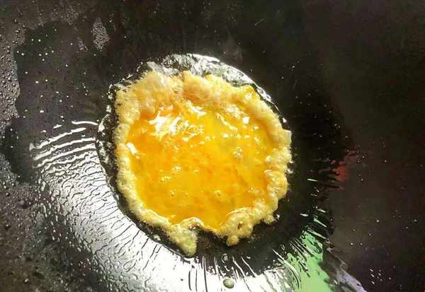 4.取出自傢的雞蛋,用清水將雞蛋的表面擦洗幹凈,洗凈後的雞蛋放在碗中,用筷子攪拌均勻。熱鍋中加入適量的油,鍋中的油溫熱後,將攪拌好的雞蛋液放入油鍋中。炒好的雞蛋盛出;