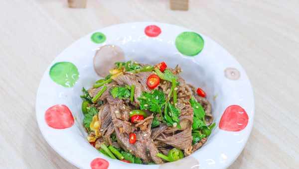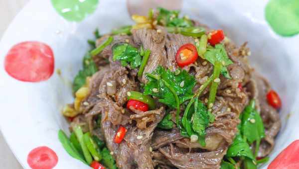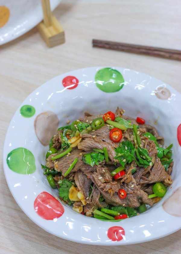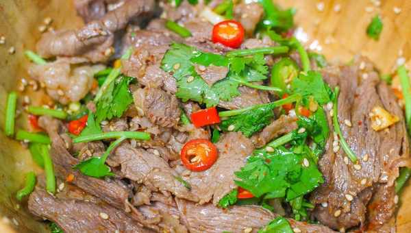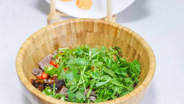 食材:肥牛,香菜,青椒,小米椒,熟白芝麻,食鹽,辣椒面,生抽,蠔油, 熱油,料酒。