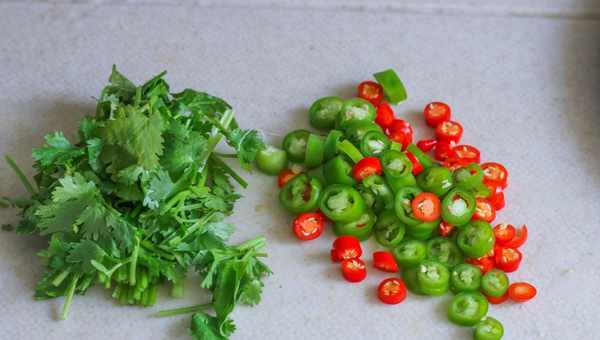 1、先準備香菜洗幹凈切成長段,青紅椒洗凈,切成小圈。