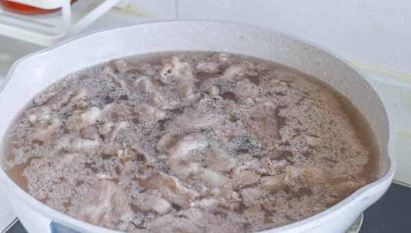 2、鍋裡水開之後,加入料酒用來去腥,把肥牛放進來焯水,煮出浮沫,最多煮一分鐘就可以瞭。