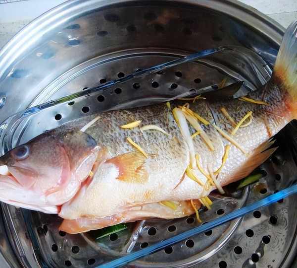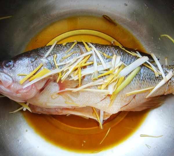 食材:鱸魚一條、鹽半勺、料酒半勺、花椒5粒、蔥、蒸魚豉油、辣椒、薑絲。