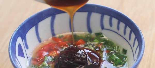 3、起鍋將油燒熱,將熱油淋到裝有蔥花、大蒜和小米辣的碗中,激發出香味,再加入一勺生抽、1勺蠔油,少許香油和適量的食用鹽、白糖、雞精,攪拌均勻備用。