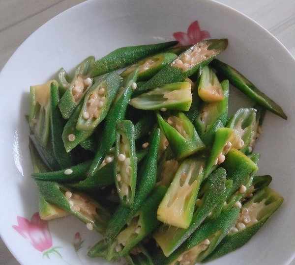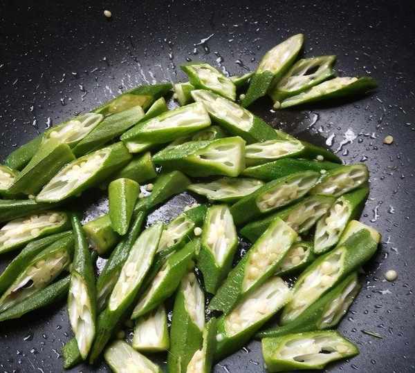 2、鍋中加入一點點油,油熱後,把秋葵放進去翻炒,直到秋葵變顏色之後,再加入適量的生抽翻炒一下即可。