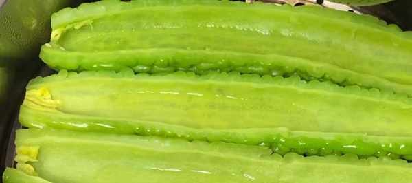 1、把苦瓜的兩頭去掉,再從中間把苦瓜對半切開,用勺子將苦瓜的白瓜瓤刮下來,並把白筋膜刮幹凈,裝入盤中備用。