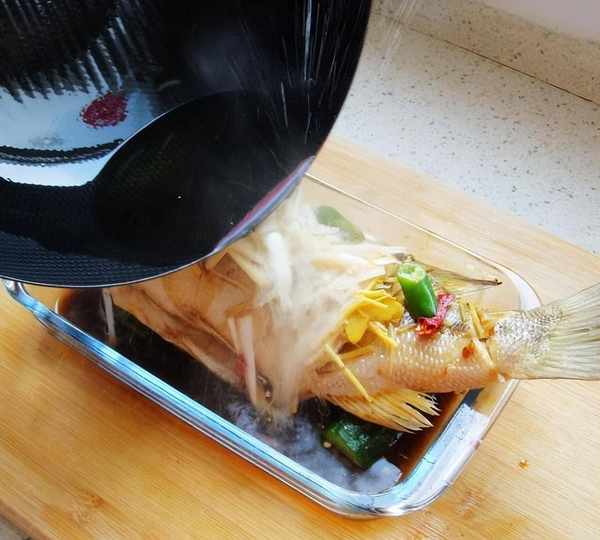 3、蒸好的魚把器皿裡的湯汁倒掉,撒上蔥薑絲,辣椒,麻椒,淋上蒸魚豉油。(不喜辣可忽略辣椒不放),燒熱少量的食用油淋在魚身上即可。