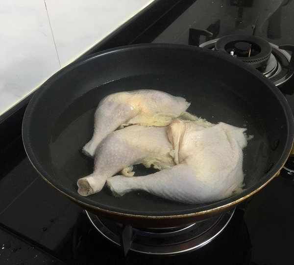 1、在鍋中加入冷水,把洗幹凈的雞腿放入冷水中大火煮大概20分鐘至雞腿熟透。