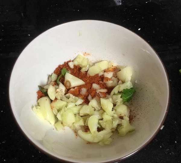 2、準備調料,將香菜切碎,大蒜切成末。取一小碗,加入1匙辣椒面,大蒜和少許鹽。
