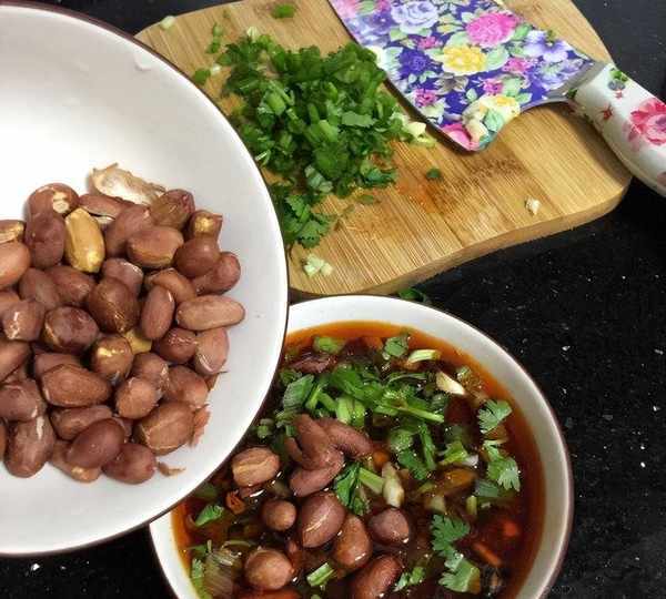 4、接著加入2匙生抽,3匙陳醋調開,再加入香菜蔥和花生米拌勻。