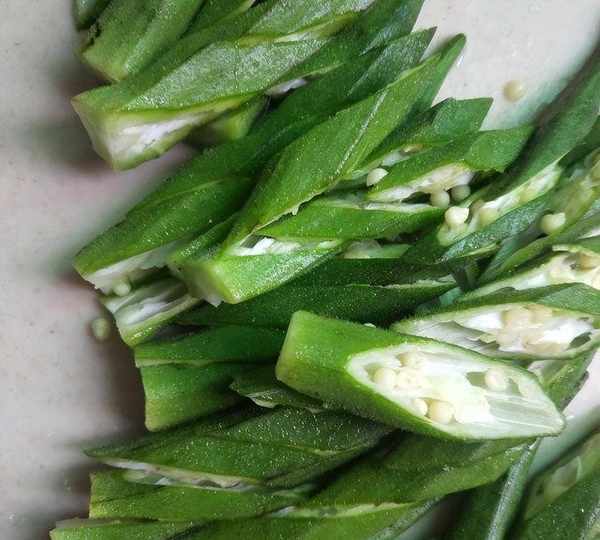 1、把新鮮的秋葵洗幹凈之後,切成一小段一小段。