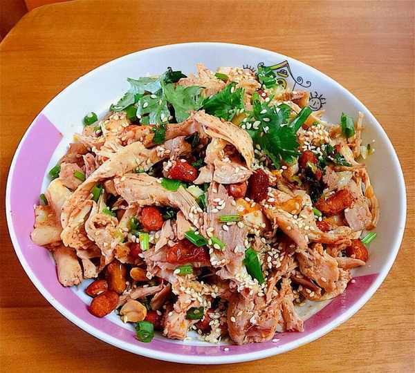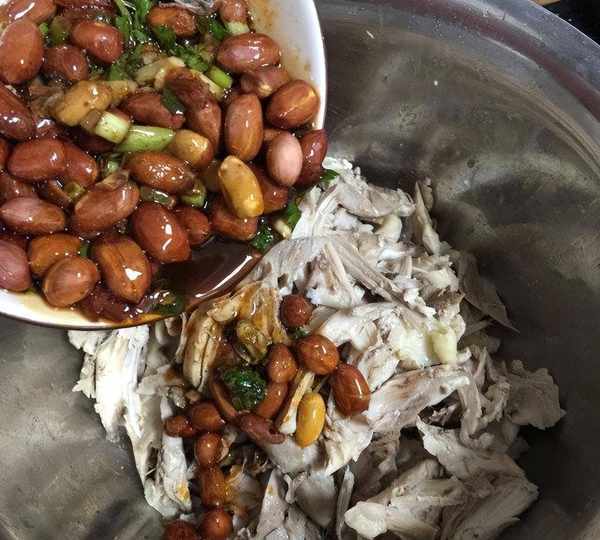 5、將涼拌好的雞腿用手撕成絲,倒入拌好的調料拌勻。