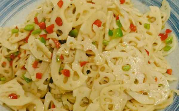 1.蓮藕洗凈切薄片,之後放入清水中洗掉淀粉。燒開水,下鍋加白醋,焯水20秒撈出,之後過一下涼白開。