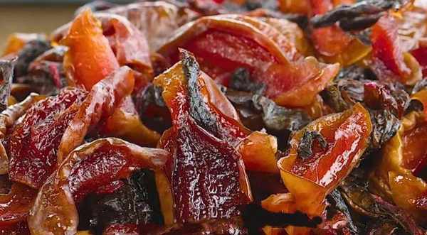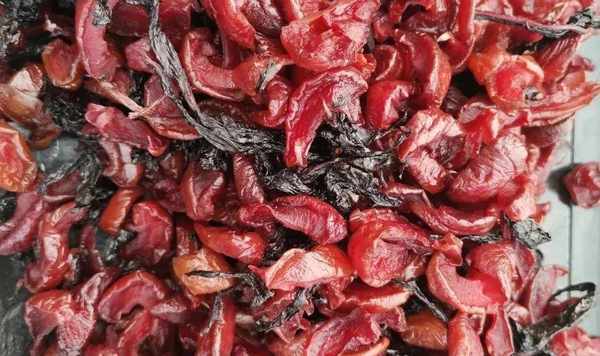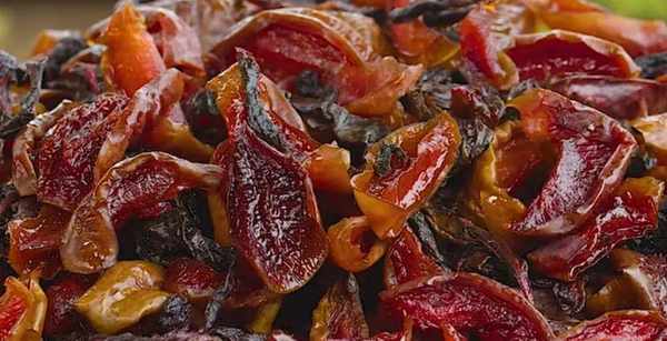 4.準備一個幹凈的平底鍋,鍋中的水分幹後,將醃好的紫蘇李子片倒入鍋中,用小火炒一會兒。炒的過程是為瞭讓李子片更加入味,前後主要炒2-3分鐘。不能炒久瞭,李子片會軟掉,口感差。炒後的李子片盛出放在竹簸箕上,用手將它們攤開,在大太陽底下進行暴曬。太陽足夠大的話,前後3天差不多就可以瞭。如果遇到天氣不要,那就需要借助烤箱烘烤,或者是放在平底鍋慢慢烘幹;