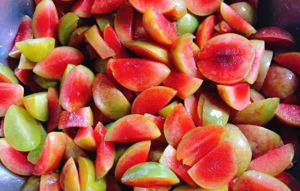 1.準備好的李子放在盆中,往裡面加入適量的水,食鹽放著浸泡會兒。經過浸泡可以將李子的表面臟東西“趕”出來,而且食鹽水有殺菌消毒的作用。經過浸泡後的李子更幹凈,吃起來菜放心。浸泡好後的李子撈出放在清水中沖洗幹凈,洗凈後的李子放在案板上切成細片,切好的放在盆中瀝幹水分;