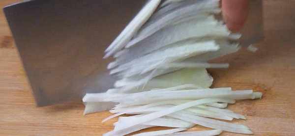 1.準備一根白蘿卜,清洗幹凈,去掉外皮,然後切成薄片,最後切成細絲備用。有擦絲器的可以直接擦成絲備用。