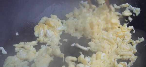 6.三個雞蛋磕入碗中,攪散。起鍋倒油,油熱下入雞蛋液,快速把它炒熟滑散,盛出備用。