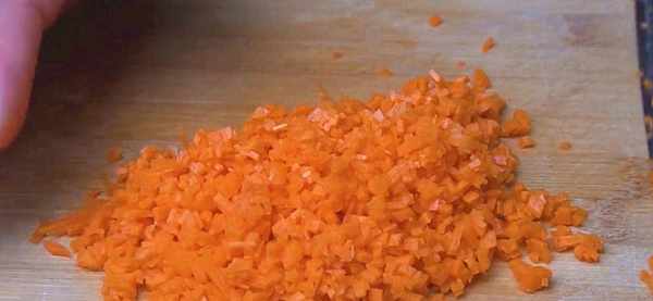 3.胡蘿卜同樣切成絲,最後切成小碎丁備用。