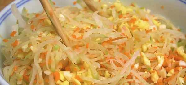5.白蘿卜 撈出來放入紗佈中,擠幹裡面的水分。放入盆中。