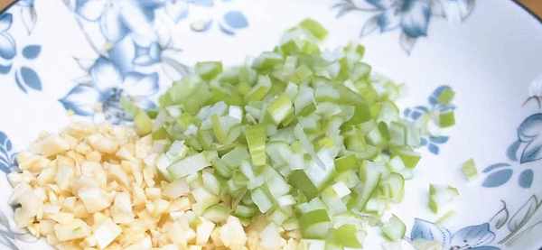 4.切點調味配菜。四五瓣大蒜切成碎末;蔥切蔥花備用。