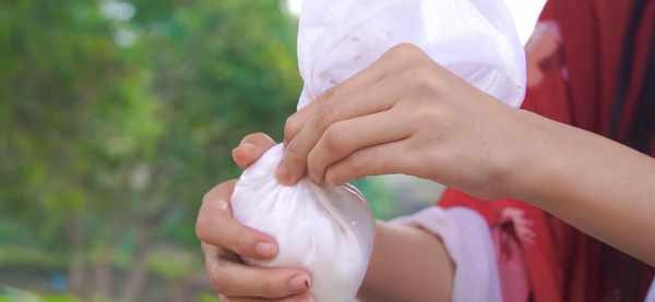 4、 將牛奶倒入紗佈袋,用力擠出水分,做成牛奶豆腐