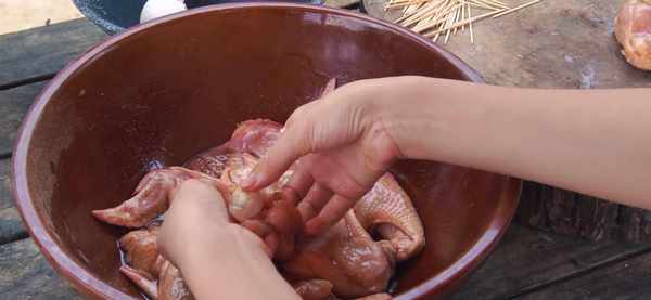 7、 取一小份奶豆腐搓圓,放入醃制好的雞翅內,用牙簽紮好收口
