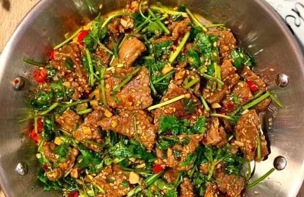 食材:牛肉,香菜。