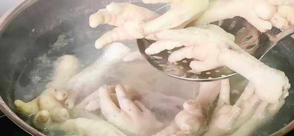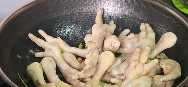 2、雞爪焯水:鍋中加入適量的清水,倒入洗凈的雞爪,放入一圈料酒,為瞭去腥,用大火把它燒開。開鍋以後撇去上面的浮沫,再煮5分鐘。時間到瞭,把雞爪撈出來,用常溫清水清洗兩遍,清洗的目的是為瞭去除粘在雞爪上的浮沫,這樣處理的雞爪更幹凈衛生,吃得也放心。