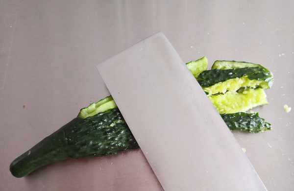 3. 黃瓜清洗幹凈,先用刀這樣拍扁,