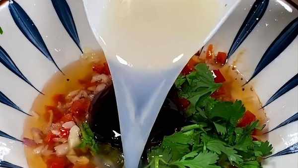 在這個時候我們準備一下其他配料,大蒜剁成末,洋蔥也把它剁碎,紅椒切成條再改刀切成粒,蔥切成蔥花,香菜切小段。碗中放蒜末、蔥末、紅椒粒,潑入燒熱的食用油,激發出調料的香味來,再放入香菜,生抽,蠔油,煮生蠔的湯,攪拌均勻備用。