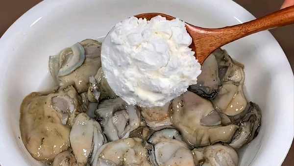 市場買來五斤生蠔,加入適量面粉,輕輕地抓拌兩分鐘。面粉的吸附性強,能帶走生蠔裡面的黏液和其他的臟東西。