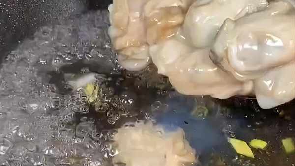 鍋中倒入食用油,油溫五成熱,放入胡椒粒和薑片,蔥段,加入多一點的開水,大火煮三分鐘,把香味煮出來後關火,再倒入生蠔泡五分鐘。