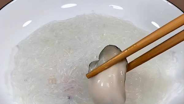 撈出泡好的生蠔,放一把粉絲煮兩分鐘撈熟,放入盤中墊底。