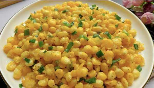 鍋中倒油,放入玉米粒,小火煎至表面金黃,然後翻面,撒上椒鹽粉,翻炒均勻撒上蔥花即可出鍋!