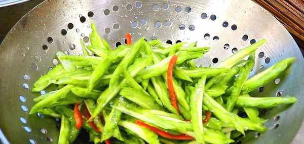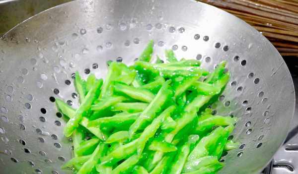 2、10分鐘過後,把苦瓜倒入漏勺中控水。