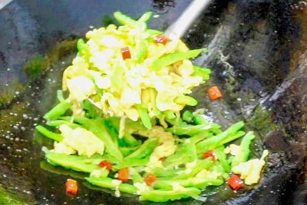 5.鍋內再添入少許食用油,倒入蔥花和紅椒爆香,再把苦瓜放進去,開小火翻炒幾下,開始調味:加入1克食鹽,上火繼續翻炒,再把雞蛋倒進去,翻炒10秒鐘後,淋入幾滴香油,簡單翻炒幾下,這道菜就做好瞭。