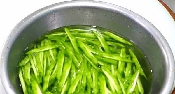 1、準備一根苦瓜,清洗幹凈後切去頭尾,分成四半,把內瓤處理幹凈,再切成薄片,放入盆中,加適量清水,浸泡10分鐘。