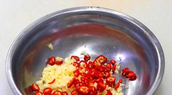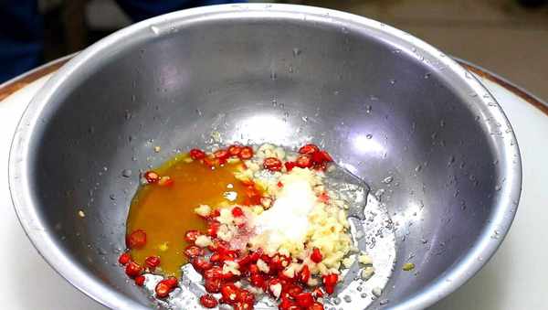 3、拿出一個小盆,把蒜末和辣椒倒進去,加入食鹽,白糖,白醋,橙汁,蔥油各適量,用筷子攪拌均勻。