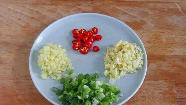 2、接著,把蔥薑蒜分別沖洗幹凈,瀝幹水之後,分別切成蔥花、薑絲和蒜片;