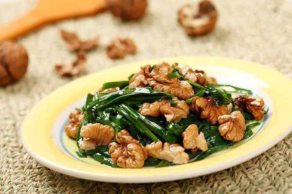 韭菜300克、核桃仁適量、宴友食用油適量、鹽適量