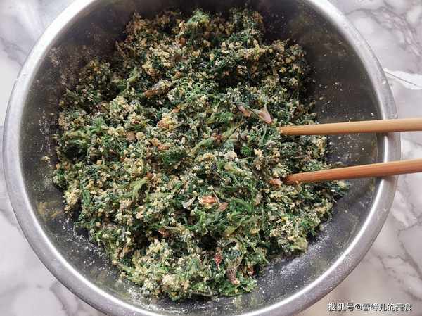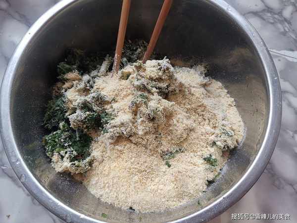 第五步:把黃豆粉倒入剁碎的白蒿中,加入適量的鹽調味。