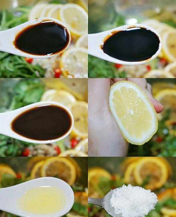 3、加入三勺生抽,一勺老抽,四勺香醋,檸檬汁加入,一勺麻油,兩小勺糖,攪勻後根據咸淡加入適量的鹽(嘗起來要有點偏咸)。