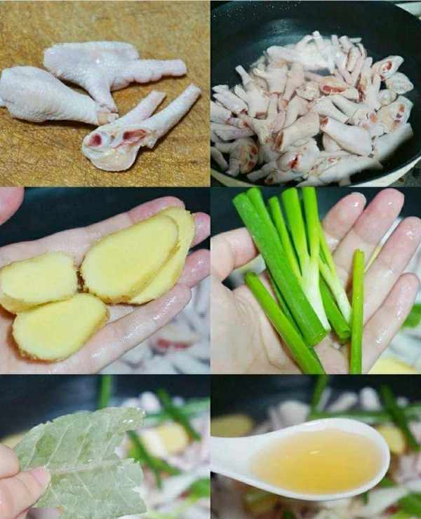 1、雞爪去掉指甲剁成小塊,冷水入鍋,加入薑片,蔥段,半片香葉和兩勺料酒,大火煮十分鐘。