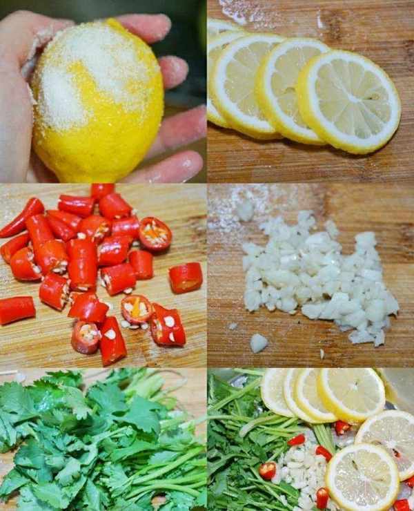 2、拿一個檸檬,用鹽搓掉表面的蠟,然後取中間的部分切片去籽,小米椒切段,蒜切碎,香菜切段,全部放到一個盆裡面。