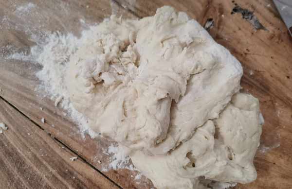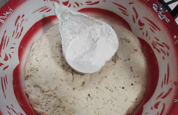 5,餡料拌好之後就可以包包子瞭,將發好的面從面盆裡拿出來,在面板上撒一些幹面粉,然後揉一下面團,排出空氣。