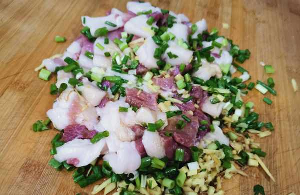 3,將豬肉切成片,裡面加入蔥薑,用刀剁碎。在農村很少有加工的肉餡的,都是買回來自己加工,我媽說自己剁的肉餡吃起來比較香,就是有點費勁。